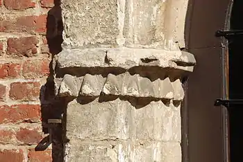 Les piédroits et les pilastres du portail présentent des impostes saillantes ornées de gouttes, motif ornemental en forme de petits pendentifs.