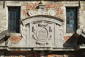 L'entablement supporte un fronton à volutes dont le tympan est orné du blason des Bruay[1].