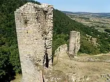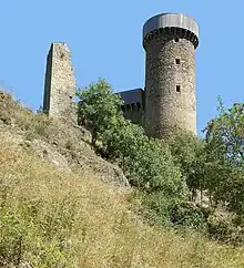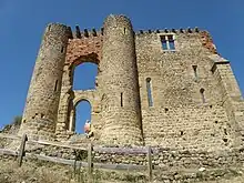 - autour de ce noyau, un terre-plein s’étendant de trois à cinq mètres en contrebas du noyau central, et entourant celui-ci sur trois côtés (nord, sud, et est, c'est-à-dire les trois côtés les mieux protégés par la déclivité naturelle de l’éperon). Ce terre-plein est environné d'une muraille d’enceinte, composée de courtines assez rectilignes, dont un long tronçon est encore visible au sud ; cette muraille d’enceinte, qui se raccorde du côté ouest (côté le plus exposé) à la tour triangulaire, comporte, sur ce même côté, deux tours d'angle circulaires, dont l'une, dominant le chemin d'accès, est plus haute et plus robuste, et aussi, ayant fait l’objet d’entretien jusqu’à la fin du XVIIIe siècle, la mieux conservée. Attendu que[29] cette tour ― dite tour ronde ou circulaire, ou encore tour des prisonniers, en raison de son ancienne fonction carcérale ― se trouve reliée de façon directe et privilégiée à la tour triangulaire (partie constitutive du noyau central) par un segment de courtine rectiligne, et compte tenu de sa haute taille, il y a lieu de la considérer, du point de vue hiérarchique et symbolique, quoique appartenant à une enceinte extérieure au noyau castral, non comme une banale tour d'angle, mais bien comme une seconde tour-maîtresse ; la dénomination de donjon qui lui est parfois appliquée n’est donc pas un terme tout à fait impropre.