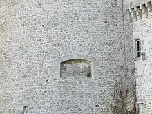 Aymery aurait alors fait encastrer un lion de pierre dans le mur de la tour aux oubliettes, appelée depuis la tour du Lion[6].