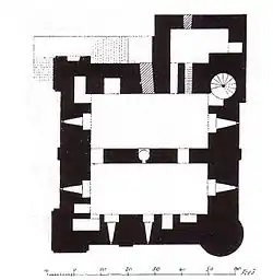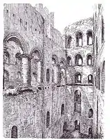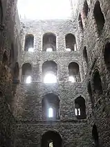 - On peut voir à l'intérieur du donjon, les traces de rubéfaction (parties rougies), vestiges de l'incendie lors du siège de 1264[1].