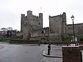 L'entrée actuelle située au nord-est occupe l'emplacement approximatif de la guérite principale construite par Gundulf puis reconstruite en 1249-1250 environ. Elle avait été détruite dans les années 1870 lorsque l'enceinte avait été transformée en jardin municipal. Une gravure de 1735 réalisée par les frères Buck (en) donne une certaine indication sur la forme de la guérite: la porte était une arche placée entre deux tours faisant saillie sur la courtine. On pouvait y accéder en empruntant une chaussée de pierre sur un fossé, plutôt qu'en franchissant un pont-levis. Une tour contenant une poterne était située dans le coin nord-ouest de l'enceinte, construite à la fin du XIVe siècle pour garder le pont enjambant la Medway. La tour et la poterne n'existent plus mais GT Clark, antiquaire et ingénieur du XIXe siècle, avait pris des notes concernant la structure alors qu'elle était encore debout et avait observé qu'elle était doté d'un mécanisme permettant d'acheminer les provisions de la rivière au château. La partie ouest de la paroi extérieure en pierre, qui faisait face à la rivière, date de l'époque à laquelle Gundulf avait construit le premier mur d'enceinte du château. Au XIXe siècle, un revêtement fut ajouté pour renforcer le mur en décomposition. Comme le donjon, il avait été construit avec de la pierre en provenance du Kent (Kentish Ragstone). Cette partie du mur de Gundulf avait une épaisseur de 1,4 m à la base pour ne faire plus que 0,61 m au sommet; sa hauteur était d'environ 6,7 m. Quatre meurtrières furent ajoutées à cette partie du mur au XIIIe siècle, les constructeurs avaient cependant imité le style normand. À l'extrémité nord du mur ouest du XIIe siècle, on peut voir les restes d'un bâtiment, probablement une salle du XIIIe siècle. Bien que détruit, on sait qu'il avait une crypte voûtée.