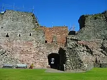 La défense avancée a une structure suivant un plan de L, dépassant dans les douves et accessible par un pont-levis. L'étage inférieur contient un tunnel d'entrée voûté allant dans la cour du château. Au-dessus, la tour de quatre étages abrite les logements royaux, et porte toujours les armoiries royales au-dessus de la porte. Une chapelle fut aussi construite au XVIe siècle, dans l'ancien château. D'une forme simple, elle mesurait environ 6 par 9 m et est à présent la seule structure à nous être parvenue de l'intérieur du mur d'enceinte. La tour nord-ouest fut transformée en colombier, et est connue comme la tour aux pigeons étant donné les boîtes pour les nids construites dans le mur extérieur.