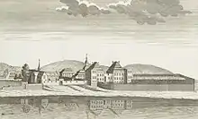 On y voit avec plaisir une large Terrasse soutenue d'un mur de pierre, qui entoure un beau Jardin. Les agréables Charmilles dont elle est ornée dans toute son étendue, sont des mieux entretenues. De ce lieu charmant on découvre de près tout ce qui se passe sur la Rivière, & sur ses deux rives, & la vue après s'être arrêtée sur différents objets, à des distances proportionnées, se perd dans des lointains très variés. Le Village du même nom, l'Eglise qui est assez belle, & plusieurs Maisons de plaisance paraissent être placés pour la perspective de ce château, qui considéré dans toutes ses parties peut être mis au rang des belles Maisons de campagne. »