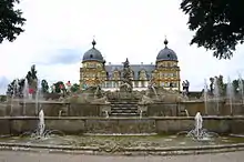 Le prince-évêque Adam de Seinsheim fait construire entre 1764 et 1771 une cascade de jeux d'eau, dédiée à Neptune, pour marquer son rang. Les plans sont de Johann Michael Fischer et les statues de Ferdinand Tietz. Un canal souterrain de 640 mètres est même creusé, tandis que les fontaines sont alimentées de différentes sources. Les jeux d'eau ne fonctionnaient plus, l'ensemble étant dans un grand état d'abandon, lorsque l'État de Bavière achète le château. La restauration a duré vingt ans, et la cascade a été inaugurée à nouveau, le .