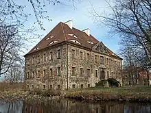Un domaine seigneurial est nommé ici en 1306. Il appartenait au seigneur Nikol von Neuershove. Il est construit sur des piliers de chêne dans une zone marécageuse et il est entouré de douves. La famille des seigneurs de Bieberstein en est propriétaire entre 1349 et 1422, puis la famille von Gersdorf. Georg von Warnsdorf l'achète en 1611, ainsi que le domaine, pour vingt-cinq mille thalers. Il est partiellement détruit par un incendie en 1683 et Maria Sidonia von Warnsdorf le fait reconstruire en style classico-baroque entre 1686-1687. C'est un bâtiment simple et massif quadrangulaire entouré d'eau sur trois côtés.