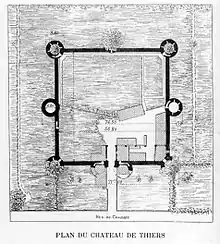 Le château de Thiers est une petite forteresse de la forme d'un carré presque régulier de 56,80 m de côté, flanqué de neuf tours rondes mesurant entre 9,60 m et 10,30 m de diamètre. Jusqu'au rez-de-chaussée, l'appareil est constitué d'un blocage de petits blocs de grès ; au-delà, des pierres de taille de calcaire de moyennes dimensions prennent le relais : signe de deux campagnes de construction distinctes, peut-être assez rapprochées dans le temps. Quatre tours se situent aux angles, trois au milieu des courtines ouest, nord et est, et deux cantonnent le portail au milieu de la courtine sud. Sauf ces deux dernières tours qui se terminent par des murs de refend plats vers la cour intérieure, les tours sont circulaires et débordent ainsi dans la cour. Si la disposition générale du château est assez conforme aux usages du XIIIe siècle, les tours d'angle débordaient généralement sur la cour par des pans coupés. L'épaisseur des murs des tours ne dépasse pas 2,00 m et peut être jugée faible en comparaison avec les grandes forteresses édifiées sous Philippe Auguste. L'état de conservation des tours varie entre la ruine presque totale pour celle de la courtine nord, et un état globalement intact jusqu'au rez-de-chaussée pour celles des courtines est et ouest, et les tours d'angle nord-est et nord-ouest.