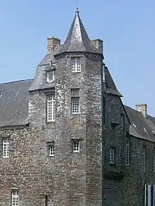 Le porche flanqué de deux tourelles, et dans la tour d'angle, une salle voutée à reçu la décoration d'une peinture murale, illustant les " Amours de Renaud et Armide "intégrées dans l'ancienne étuve[3].