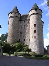 Le château de Val a été construit au XIVe et au début du XVe siècle sur les fondations d'un château du XIIIe siècle. Il se présente sous la forme d'un haut corps de logis rectangulaire que flanquent de près six tourelles d'angle couronnées de mâchicoulis et coiffées en poivrière. La tour d'angle des communs ajoutés aux XVe et XVIIIe siècles est un vestige de l'enceinte du XIIIe siècle[3].