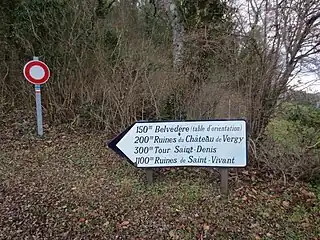 L'église Saint-Saturnin de Vergy se trouve à 140 m au nord des ruines du château, le long du chemin d'accès et à 465 m d'altitude. L'abbaye Saint-Vivant est à la pointe sud de l'éperon, à 450 m d'altitude et donc à 45 m en dessous du sommet sud de la crête[1]. Une croix de chemin se tient au bord du chemin menant à 300 m en contrebas de l'église[3].