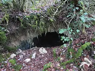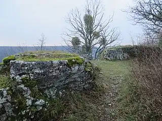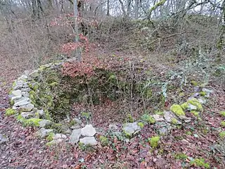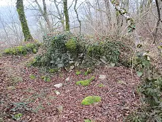 Un des rares vestiges de mur du château, recouvert par la végétation. | |