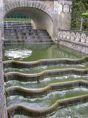Les jardins de la Renaissance française sont caractérisés par des plates-bandes ou parterres symétriques et géométriques, des plantes en pots, des allées de sable et gravier, des terrasses, des escaliers et des rampes, des eaux courantes sous forme de canaux, de cascades et de fontaines monumentales, et par l'usage extensif de grottes artificielles, de labyrinthes et des statues de personnages mythologiques[45]. Ils devinrent une extension des châteaux qu'ils entouraient, et furent conçus pour illustrer les idéaux de mesure et de proportion de la Renaissance et pour rappeler les vertus de la Rome antique[45].