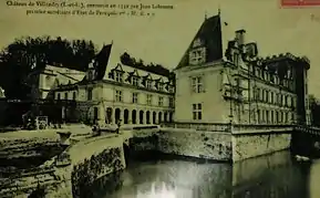 - Le domaine de Colombiers est finalement acquis le 4 mars 1532 (hommage en avril 1533) par Jean (Le) Breton (v. 1490-1542)[18],[19], président de la Chambre des comptes de Blois, qui partagea la captivité de François Ier à Pavie[16]. Alors qu'on édifie pour lui le château de Villesavin, le secrétaire des Finances et secrétaire-contrôleur général des Guerres, bailli-gouverneur de Blois, se résout à faire raser la forteresse médiévale de Villandry dans le but de se faire construire une grande demeure dont le style exprimera a posteriori la transition entre la Première et la Seconde Renaissance française[16],[20]. Le nouveau propriétaire, exploite à Villandry son exceptionnelle expérience de l’architecture acquise sur de nombreux chantiers, dont celui du château de Chambord qu’il a surveillé et dirigé pendant de longues années pour le compte de la Couronne. Grâce aux capacités financières de Jean Le Breton, les travaux vont bon train et l'édifice est pratiquement achevé en 1536. François Ier viendra d'ailleurs à de nombreuses reprises s'enquérir de l'avancée des travaux sur l'invitation de Jean Le Breton.