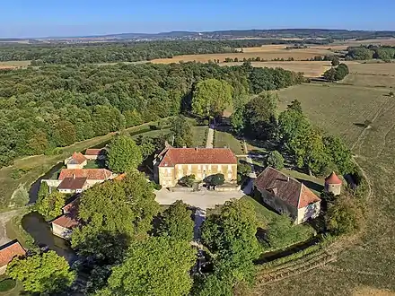 Le château et ses dépendances entourés de la douve circulaire.