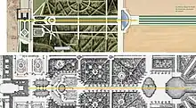 Le promeneur qui remontait l'allée du Tapis vert découvrait la vue sur le bassin où se mirait le château. Il remontait ensuite par les rampes latérales pour rejoindre de nouveau le parterre. Durant toute cette remontée de l'axe du jardin, le petit pavillon situé près du château servait de point de fuite, axé sur la perspective.