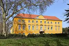 A l'est du château se trouvent les corps de ferme des XVIIe et XVIIIe siècles, qui renferment une large cour presque carrée. Les bâtiments à un et deux étages ont de larges voûtes d'arêtes et de lunettes avec des faîtages en plâtre, ainsi que des voûtes carrées reposant sur des arcs en ceinture. Également à l'est du palais se trouvait une trémie à deux étages avec un haut toit à pignon jusqu'à sa démolition en . Il existait un portail en arc de selle sur le côté ouest. Les fenêtres et les portes possédaient des montants en pierre.