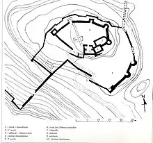 L'accès à la forteresse se fait par le raval au sud, une pente naturelle, et un chemin. Puis, un passage coudé permet d'accéder à la basse-cour close par un premier rempart. L'accès à la forteresse se fait par un deuxième accès coudé pratiqué dans la deuxième enceinte. À l'est de l'entrée se trouvaient les bâtiments. Il reste les traces du donjon, la chapelle et des bâtiments pour le service, ainsi que d'une ancienne citerne chrétienne.