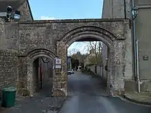On accède à la cour d'honneur par une porte charretière et une porte piétonne à triple voussures du XVIIe siècle[4]. À l'intérieur de la cour se dresse ce qui subsiste du château[5] ; un pavillon central s'éclairant par des fenêtres à meneaux encadré par deux tours rondes.