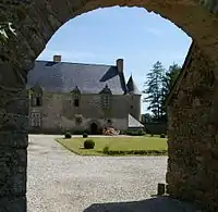 - « La maison seigneuriale de la Courbe est affectée au logement du fermier. On entre dans la cour par un vieux portail en plein cintre surmonté d'un pavillon en ruine protégé jadis par un pont-levis. Le bâtiment principal au fond de la cour, est flanqué de deux tours au midi, dont l'une ronde et l'autre à pans coupés. Les croisées de la façade située au nord ont été renouvelées et elles portent le caractère d'une date peu ancienne ; les portes d'entrée sont ogivales à l'extérieur et à plein cintre à l'intérieur. Ce bâtiment avait été accolé à un ancien édifice dont la charpente et les planchers ou les voûtes ont disparu. On distingue l'emplacement de deux salles immenses ; la première, qui offre une longueur de seize mètres sur huit de largeur, conserve le nom de petite salle ; la seconde longue de dix-neuf mètres environ et large de neuf s'appelle la Grande-Salle. Les murailles ont presque deux mètres d'épaisseur et les ouvertures sont à plein-cintre. Au-dessus régnait un étage qu'on exploitait par un escalier en pierre de granit, construit dans une tour fort élevée et qu'on nommait la Gloriette. La hauteur de chacune des marches ne dépasse pas quatre-vingts millimètres. Ce magnifique escalier qui semble avoir été refait au XVe s. est couronné par une voûte élégante ; sur la clé on a gravé des armes que l'obscurité et la poussière empêchent de distinguer. De la dernière marche on monte dans un escalier en pierre fort étroit et qui conduit à la partie supérieure de la tour. À côté se trouvait la chapelle dont il ne reste plus que quelques débris. Les murailles du jardin étaient garnies de nombreuses meurtrières et défendues à l'extrémité occidentale par une tour dont on voit encore les ruines. De profonds fossés cernaient le château, la cour et le jardin. » (Gérault.)