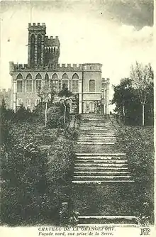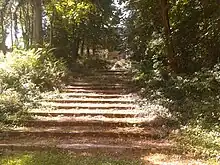 Sur la photo de gauche, l'escalier partant de la serre et menant au château est volontairement bordé de végétation et clairement dégagé. À l'heure actuelle, la nature et la végétation anciennement plantée ont pris le dessus sur cet escalier ainsi que sur les bassins ornant chacun des deux paliers (qui ne sont pas visibles sur ces images).