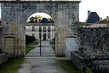 L'entrée se fait par un porche dans le mur et donne sur une avant-cour bordée des deux côtés de dépendances à un étage couvertes de longs toits de tuiles.
