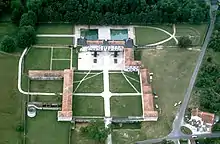 L'allée centrale passe une balustrade pour arriver au logis en U autour de la cour. Ne subsiste que l'aile Ouest.