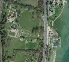 Le domaine est constitué de vastes pelouses, parsemées d’arbres séculaires, montant en pente douce jusqu’au château. Celui-ci est implanté sur une terrasse surplombant, du côté du lac, le jardin à la française, et se prolongeant, du côté sud, par une pièce d’eau et une vaste allée de marronniers.