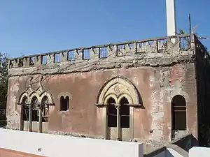 La structure extérieure présente une façade en briques apparentes, les ouvertures sont des fenêtres à meneaux ogivales avec des montants en pierre, des pierres de taille en tuf et en pierre de lave.