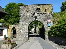 Les mures sont en grauwacke et en ardoise, les arcs en tuf volcanique. Des 4 niveaux, celui le plus bas comprend 2 salles avec des voûtes en berceau. Les bâtisses du château s'étendent à partir du donjon vers l'ouest sur une longueur de 200 m environ, dont une bonne moitié est occupé par le château principal.