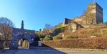 Un nombre total de 6 portes sont à franchir pour accéder au château depuis la basse-cour. De cette dernière subsistent aujourd'hui également de nombreux vestiges, dont des murs et des restes provenant de bâtiments et de tours.