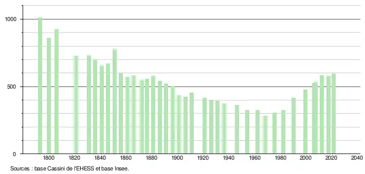 L'évolution du nombre d'habitants est connue à travers les recensements de la population effectués dans la commune depuis 1793. Pour les communes de moins de 10 000 habitants, une enquête de recensement portant sur toute la population est réalisée tous les cinq ans, les populations légales des années intermédiaires étant quant à elles estimées par interpolation ou extrapolation[22]. Pour la commune, le premier recensement exhaustif entrant dans le cadre du nouveau dispositif a été réalisé en 2007[23].