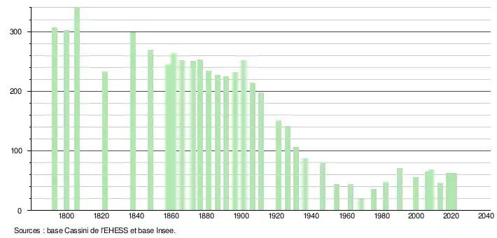 L'évolution du nombre d'habitants est connue à travers les recensements de la population effectués dans la commune depuis 1793. Pour les communes de moins de 10 000 habitants, une enquête de recensement portant sur toute la population est réalisée tous les cinq ans, les populations légales des années intermédiaires étant quant à elles estimées par interpolation ou extrapolation[20]. Pour la commune, le premier recensement exhaustif entrant dans le cadre du nouveau dispositif a été réalisé en 2008[21].