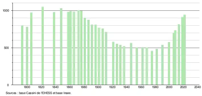 L'évolution du nombre d'habitants est connue à travers les recensements de la population effectués dans la commune depuis 1793. Pour les communes de moins de 10 000 habitants, une enquête de recensement portant sur toute la population est réalisée tous les cinq ans, les populations légales des années intermédiaires étant quant à elles estimées par interpolation ou extrapolation[16]. Pour la commune, le premier recensement exhaustif entrant dans le cadre du nouveau dispositif a été réalisé en 2008[17].
