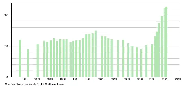 L'évolution du nombre d'habitants est connue à travers les recensements de la population effectués dans la commune depuis 1793. Pour les communes de moins de 10 000 habitants, une enquête de recensement portant sur toute la population est réalisée tous les cinq ans, les populations légales des années intermédiaires étant quant à elles estimées par interpolation ou extrapolation[23]. Pour la commune, le premier recensement exhaustif entrant dans le cadre du nouveau dispositif a été réalisé en 2004[24].