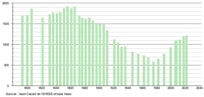 L'évolution du nombre d'habitants est connue à travers les recensements de la population effectués dans la commune depuis 1793. Pour les communes de moins de 10 000 habitants, une enquête de recensement portant sur toute la population est réalisée tous les cinq ans, les populations légales des années intermédiaires étant quant à elles estimées par interpolation ou extrapolation[22]. Pour la commune, le premier recensement exhaustif entrant dans le cadre du nouveau dispositif a été réalisé en 2007[23].