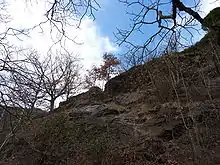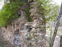 En revanche, le mur sud du côté de la chapelle est en trop mauvais état pour que l'on puisse juger de sa fonction défensive ou résidentielle. La présence d'un donjon reste hypothétique. Soit il était adossé au mur nord surplombant le village comme semble l'attester les nombreuses ouvertures citées précédemment. Soit il était situé à l'ouest de l'enceinte supérieure du côté de la rivière de l'Aston car on repère les marques d'un mur séparant cette enceinte et créant un espace d'une quarantaine de mètres carrés au sol. Dans les deux cas, si le donjon a existé, il n'occupait pas une position centrale car le site et les vestiges ne s'y prêtent pas[9].