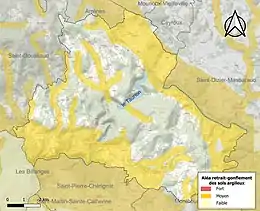 Le retrait-gonflement des sols argileux est susceptible d'engendrer des dommages importants aux bâtiments en cas d’alternance de périodes de sécheresse et de pluie. 49,1 % de la superficie communale est en aléa moyen ou fort (33,6 % au niveau départemental et 48,5 % au niveau national). Sur les 402 bâtiments dénombrés sur la commune en 2019, 248 sont en aléa moyen ou fort, soit 62 %, à comparer aux 25 % au niveau départemental et 54 % au niveau national. Une cartographie de l'exposition du territoire national au retrait gonflement des sols argileux est disponible sur le site du BRGM[17],[Carte 2].
