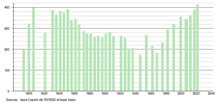 L'évolution du nombre d'habitants est connue à travers les recensements de la population effectués dans la commune depuis 1793. Pour les communes de moins de 10 000 habitants, une enquête de recensement portant sur toute la population est réalisée tous les cinq ans, les populations légales des années intermédiaires étant quant à elles estimées par interpolation ou extrapolation[15]. Pour la commune, le premier recensement exhaustif entrant dans le cadre du nouveau dispositif a été réalisé en 2007[16].