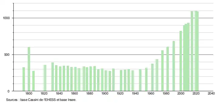 L'évolution du nombre d'habitants est connue à travers les recensements de la population effectués dans la commune depuis 1793. Pour les communes de moins de 10 000 habitants, une enquête de recensement portant sur toute la population est réalisée tous les cinq ans, les populations légales des années intermédiaires étant quant à elles estimées par interpolation ou extrapolation[17]. Pour la commune, le premier recensement exhaustif entrant dans le cadre du nouveau dispositif a été réalisé en 2004[18].