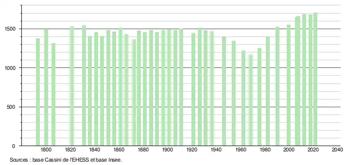 L'évolution du nombre d'habitants est connue à travers les recensements de la population effectués dans la commune depuis 1793. Pour les communes de moins de 10 000 habitants, une enquête de recensement portant sur toute la population est réalisée tous les cinq ans, les populations légales des années intermédiaires étant quant à elles estimées par interpolation ou extrapolation[32]. Pour la commune, le premier recensement exhaustif entrant dans le cadre du nouveau dispositif a été réalisé en 2007[33].