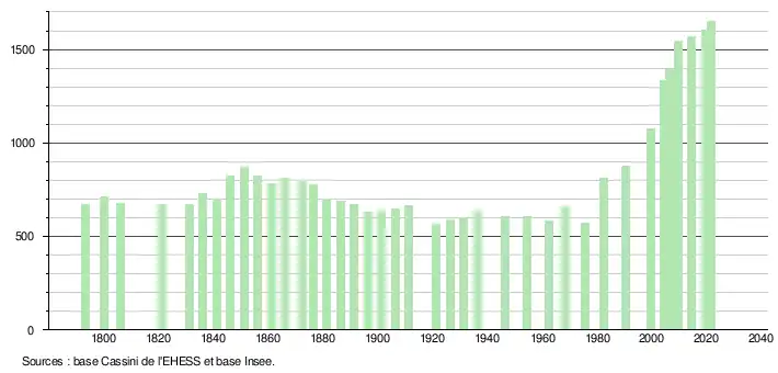 L'évolution du nombre d'habitants est connue à travers les recensements de la population effectués dans la commune depuis 1793. Pour les communes de moins de 10 000 habitants, une enquête de recensement portant sur toute la population est réalisée tous les cinq ans, les populations légales des années intermédiaires étant quant à elles estimées par interpolation ou extrapolation[24]. Pour la commune, le premier recensement exhaustif entrant dans le cadre du nouveau dispositif a été réalisé en 2004[25].