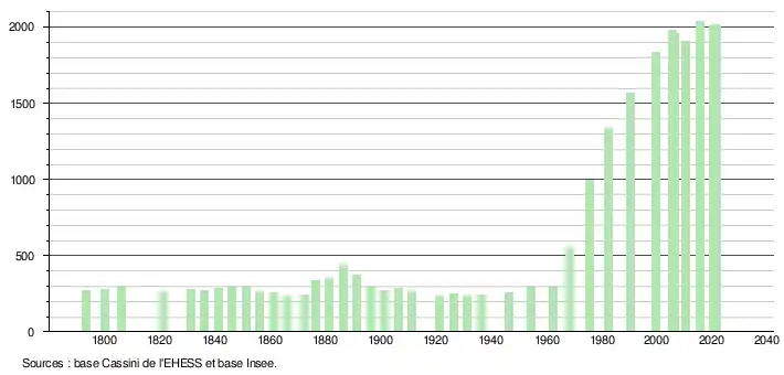 L'évolution du nombre d'habitants est connue à travers les recensements de la population effectués dans la commune depuis 1793. Pour les communes de moins de 10 000 habitants, une enquête de recensement portant sur toute la population est réalisée tous les cinq ans, les populations légales des années intermédiaires étant quant à elles estimées par interpolation ou extrapolation[22]. Pour la commune, le premier recensement exhaustif entrant dans le cadre du nouveau dispositif a été réalisé en 2005[23].