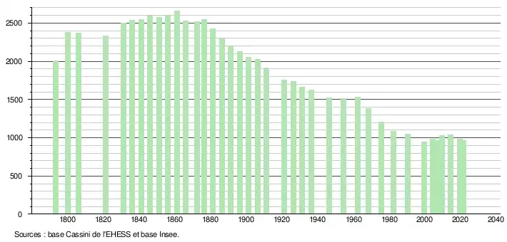 L'évolution du nombre d'habitants est connue à travers les recensements de la population effectués dans la commune depuis 1793. Pour les communes de moins de 10 000 habitants, une enquête de recensement portant sur toute la population est réalisée tous les cinq ans, les populations légales des années intermédiaires étant quant à elles estimées par interpolation ou extrapolation[21]. Pour la commune, le premier recensement exhaustif entrant dans le cadre du nouveau dispositif a été réalisé en 2004[22].