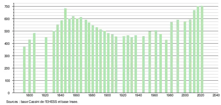 L'évolution du nombre d'habitants est connue à travers les recensements de la population effectués dans la commune depuis 1793. Pour les communes de moins de 10 000 habitants, une enquête de recensement portant sur toute la population est réalisée tous les cinq ans, les populations légales des années intermédiaires étant quant à elles estimées par interpolation ou extrapolation[16]. Pour la commune, le premier recensement exhaustif entrant dans le cadre du nouveau dispositif a été réalisé en 2006[17].