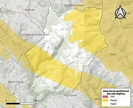 Les mouvements de terrains susceptibles de se produire sur la commune sont des tassements différentiels[39]. Le retrait-gonflement des sols argileux est susceptible d'engendrer des dommages importants aux bâtiments en cas d’alternance de périodes de sécheresse et de pluie[40]. 50,4 % de la superficie communale est en aléa moyen ou fort (58,6 % au niveau départemental et 48,5 % au niveau national métropolitain)[Carte 4]. Depuis le , en application de la loi ÉLAN, différentes contraintes s'imposent aux vendeurs, maîtres d'ouvrages ou constructeurs de biens situés dans une zone classée en aléa moyen ou fort[Note 4],[41].