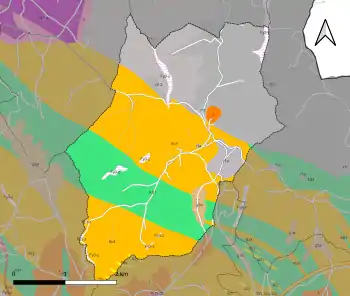 L'occupation des sols de la commune, telle qu'elle ressort de la base de données européenne d’occupation biophysique des sols Corine Land Cover (CLC), est marquée par l'importance des forêts et milieux semi-naturels (59,4 % en 2018), une proportion sensiblement équivalente à celle de 1990 (59,8 %). La répartition détaillée en 2018 est la suivante : forêts (59,4 %), prairies (25,9 %), zones agricoles hétérogènes (14,7 %)[33]. L'évolution de l’occupation des sols de la commune et de ses infrastructures peut être observée sur les différentes représentations cartographiques du territoire : la carte de Cassini (XVIIIe siècle), la carte d'état-major (1820-1866) et les cartes ou photos aériennes de l'IGN pour la période actuelle (1950 à aujourd'hui)[Carte 3].
