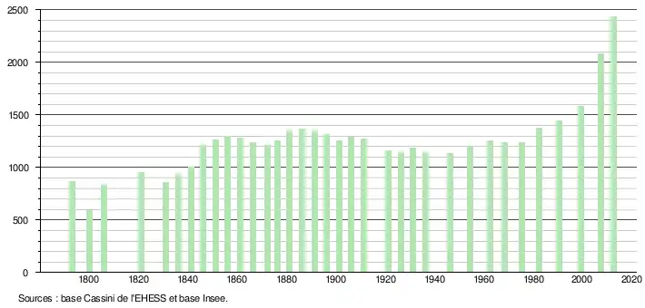 - Par convention dans Wikipédia, le principe a été retenu de n’afficher dans le tableau des recensements et le graphique, pour les populations légales postérieures à 1999, que les populations correspondant à une enquête exhaustive de recensement pour les communes de moins de 10 000 habitants, et que les populations des années 2006, 2011, 2016, etc. pour les communes de plus de 10 000 habitants, ainsi que la dernière population légale publiée par l’Insee pour l'ensemble des communes.