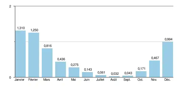 Sur cette courte période d'observation, le débit journalier maximal a été observé le pour 18,20 m3/s. Le débit instantané maximal a été observé le même [note 3] avec 23,20 m3/s en même temps que la hauteur maximale instantanée de 303 cm soit 3,03 m[3].