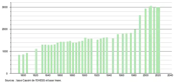L'évolution du nombre d'habitants est connue à travers les recensements de la population effectués dans la commune depuis 1793. Pour les communes de moins de 10 000 habitants, une enquête de recensement portant sur toute la population est réalisée tous les cinq ans, les populations légales des années intermédiaires étant quant à elles estimées par interpolation ou extrapolation[26]. Pour la commune, le premier recensement exhaustif entrant dans le cadre du nouveau dispositif a été réalisé en 2008[27].