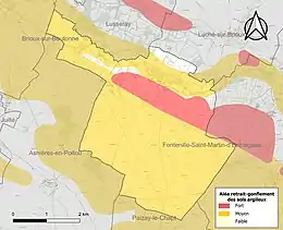 Les mouvements de terrains susceptibles de se produire sur la commune sont des tassements différentiels[17]. Le retrait-gonflement des sols argileux est susceptible d'engendrer des dommages importants aux bâtiments en cas d’alternance de périodes de sécheresse et de pluie[18]. 95,2 % de la superficie communale est en aléa moyen ou fort (54,9 % au niveau départemental et 48,5 % au niveau national)[Carte 2]. Depuis le , en application de la loi ELAN, différentes contraintes s'imposent aux vendeurs, maîtres d'ouvrages ou constructeurs de biens situés dans une zone classée en aléa moyen ou fort[Note 2],[19].